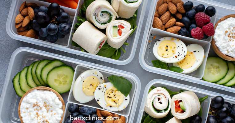 Mix and match foods. Shoot for a total of 100-125 calories for snacks and 200-250 calories for a meal. Buy small divided dishes or divvy bulk foods into re-closable snack bags and meal prep once for the week.