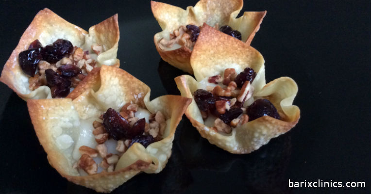 Preheat oven to 350 degrees. Spray a muffin pan with nonstick spray and press wonton wrappers into cups. Lightly spray with nonstick spray, bake at 350 degrees for 8 minutes. Add chopped cheese and return to the oven until cheese has melted. Sprinkle on cranberries and pecans and finish with a dash of cinnamon. Makes 12 servings.