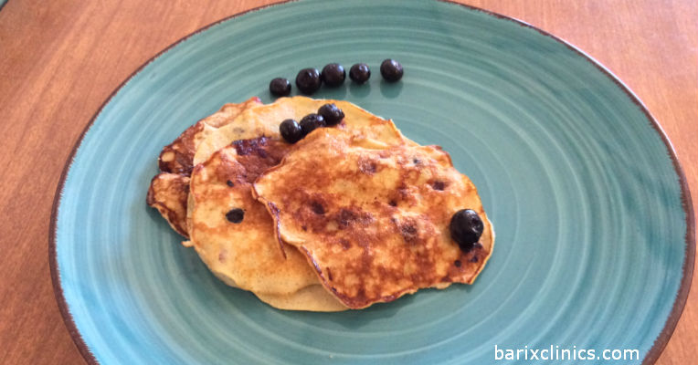 Mix all ingredients except blueberries. Spray nonstick pan with cooking spray and preheat to medium. Pour ¼ cup of batter at a time to make small pancakes—should make 5 pancakes. Sprinkle each pancake with blueberries. Flip when bottom side is done. Continue cooking until bottom is golden brown and center is done. Makes 5 pancakes.