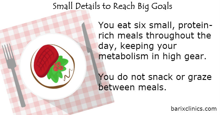 - Fifteen – You eat six small, protein-rich meals throughout the day, keeping your metabolism in high gear. You do not snack or graze between meals.