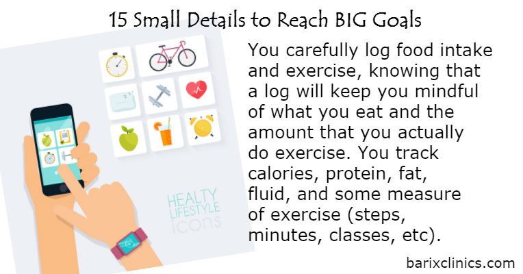 - Two – You carefully log food intake and exercise, knowing that a log will keep you mindful of what you eat and the amount that you actually do exercise. You track calories, protein, fat, fluid, and some measure of exercise (steps, minutes, classes, etc).