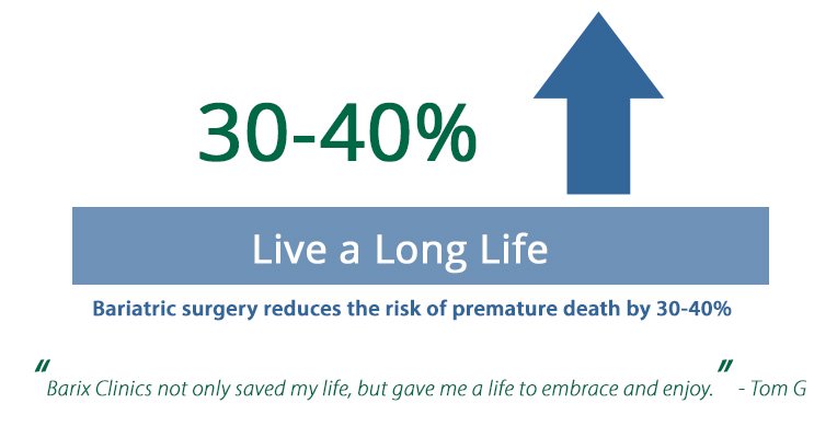 Chances are that bariatric surgery will prolong your life. If you have a BMI of > 30, you have a 50-100% greater risk of premature death than someone within a healthy weight range. Weight loss surgery reduces that risk by 30-40%.
