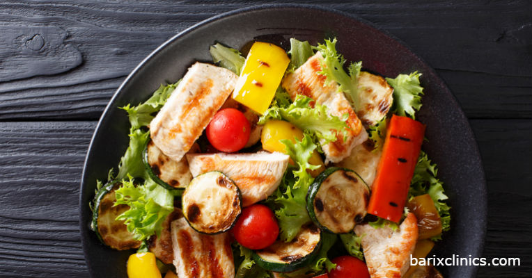 Salads are a great way to go in the summer heat. Add a variety of fresh vegetables and fruits, a healthy protein source (chicken breast, salmon, tuna, cottage cheese, or shrimp), go light or without cheese, and choose a light no-added-sugar dressing. Skinny Girl Poppyseed Salad Dressing (available online or at Walmart) is perfect for light summer salads.