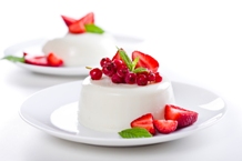 When ready to serve, dip the ramekins or dessert cups into hot water for about 10 seconds to loosen the panna cotta from the cups. Unmold the panna cotta by placing a dessert plate on top of the ramekin. Holding firmly, turn the plate and ramekin over so that the panna cotta falls out of the mold and onto the dessert plate. Surround each panna cotta with 1/2 cup mixed berries. Makes 8 servings.
