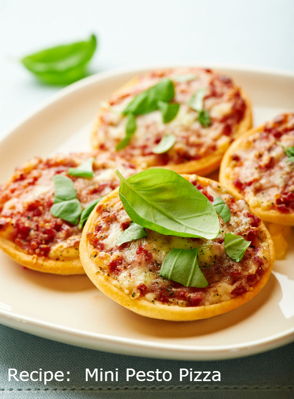 Top 12 of the pitas with one tablespoon of pizza sauce, one tablespoon mozzarella cheese and one slice of pepperoni. Top each of the other 12 with 1/2 tablespoon of pesto sauce, 1 tablespoon mozzarella cheese, and a slice of tomato.