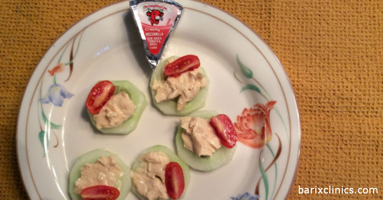 Spread the Laughing Cow cheese on the sliced cucumber and garnish with grape tomato wedge. Enjoy! Makes 1 serving.