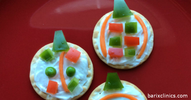 Mix cream cheese and garlic powder together until smooth. Spread in an even circle onto crackers. Cut up vegetables into small shapes and place to decorate. Makes 12 servings.